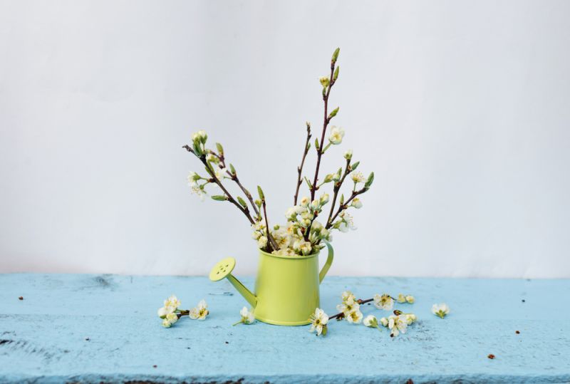 Gebruik je takken uit eigen tuin? Knip dan enkele takken met dikke bloesemknoppen die al goed zichtbaar zijn af. Zet de takken eerst een dag of twee in een emmer water in de garage of de koudste kamer van het huis om ze aan de warmere temperaturen in de huiskamer te laten wennen.