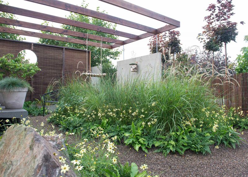 Door de klimaatverandering en de pandemie worden we ons ervan bewust dat er iets moet veranderen. Onbekommerd consumeren is niet meer van deze tijd. Thema’s als duurzaamheid en natuur zijn van toenemend belang. In de tuin kun je een stukje natuur creëren, waarin je je helemaal kunt afzonderen. Een ideale omgeving om tot rust te komen of om ongestoord te kunnen werken. Biodiversiteit en wateropvang zijn belangrijk. Richt de tuin in als een klein ecosysteem, ofwel 'biotoop'. Laat je letterlijk omringen door hoge planten, zoals siergrassen. Grindpaden of een terras van grind zorgen ervoor dat regenwater in de bodem kan doordringen. Regenwater kan ook worden opgevangen in een minivijver met waterplanten. Duurzame schuttingen van beton en riet zorgen voor beschutting en een ambachtelijke uitstraling. Tussen het vele groen knallen de gele bloemen van meisjesogen (Coreopsis) eruit als vrolijk accent. Bovendien bloeien deze planten lang en zijn de bloemen ook geschikt als snijbloem voor in een vaas.