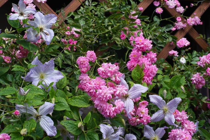 Doorbloeiende klimrozen en clematissen zijn van oudsher een gouden combinatie, maar ook op zichzelf zijn ze meer dan de moeite waard. Ze hebben bloemen in ontelbaar veel kleuren, kleurcombinaties en vormen. Stem de kleuren subtiel op elkaar af of laat ze juist lekker contrasteren. Clematissen bloeien eigenlijk niet zo héél lang, maar je hebt drie groepen die of vroeg, in de zomer of juist laat in het jaar (en zelfs in de winter!) bloeien. Probeer dus als het even kan en je genoeg ruimte hebt, verschillende soorten clematis in je tuin of in potten of bakken op je balkon te planten. Clematissen hebben trouwens de wonderlijke gewoonte dat ze graag koele, schaduwrijke 'voeten' of wortels hebben, terwijl hun ranken juist rijker bloeien in de zon. Zorg dus voor een paar bodembedekkers of vaste planten aan de voet ervan. Doorbloeiende rozen bloeien nóg langer wanneer je ze in het voorjaar of tussentijds voorziet van speciale rozenmest of rozenvoeding. Knip regelmatig uitgebloeide bloemen weg (knip ze terug tot op een takje met vijf gezonde bladeren). De meeste rozen zijn zonaanbidders, maar er zijn enkele soorten die floreren in halfschaduw. Vraag ernaar in ons tuincentrum.
